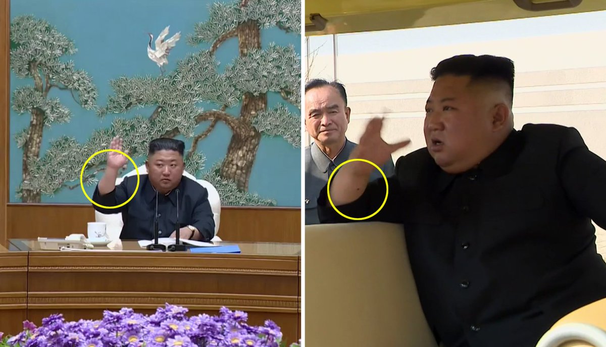 米国拠点の北朝鮮専門のニュースサイト・NKニュースは、朝鮮中央テレビが報じた、5月1日の順川(スンチョン)燐酸肥料工場竣工式と4月11日の朝鮮労働党政治局会議での金正恩氏の映像を比較。前者では、金正恩氏の右手首に小さな傷跡のようなものが見られるのに対し、後者では確認できないことを指摘した。